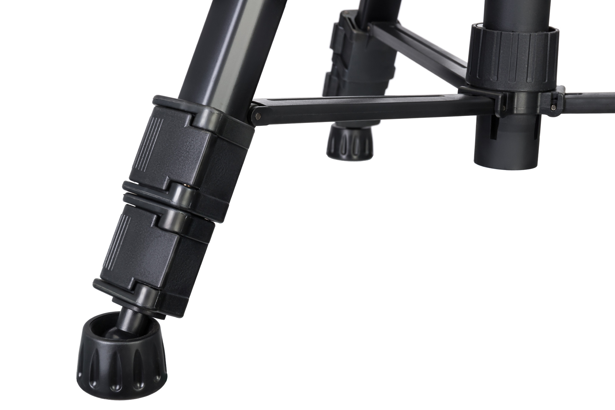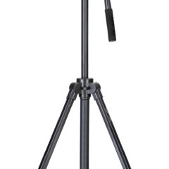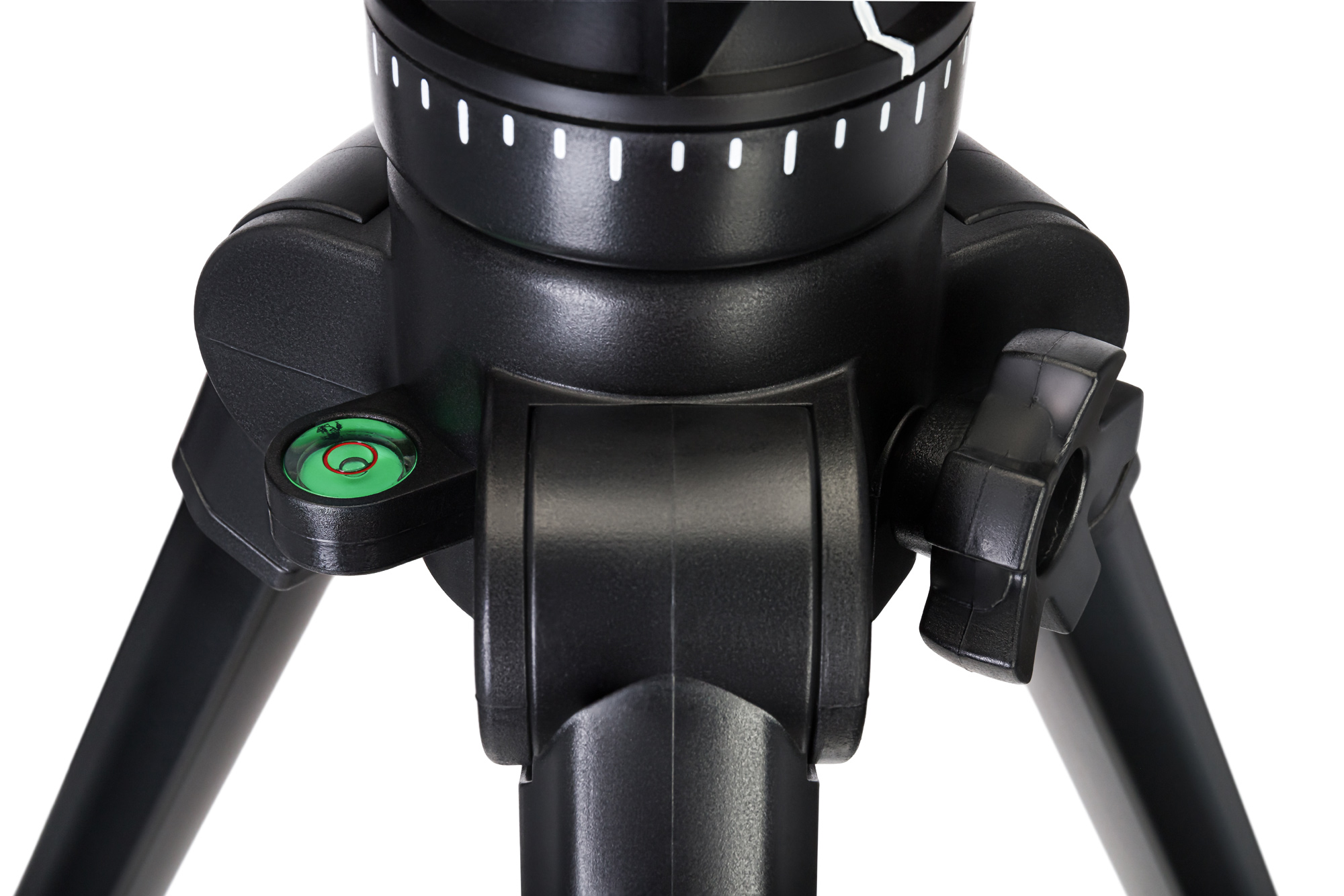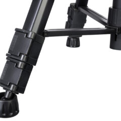 El trípode está hecho de metal. Sus patas extensibles cuentan con un sistema de pestañas de bloqueo que permite un ajuste rápido de la altura. También puede subir y bajar la columna central. El nivel de burbuja permite nivelar cómodamente con respecto al suelo la cámara que tengamos instalada.